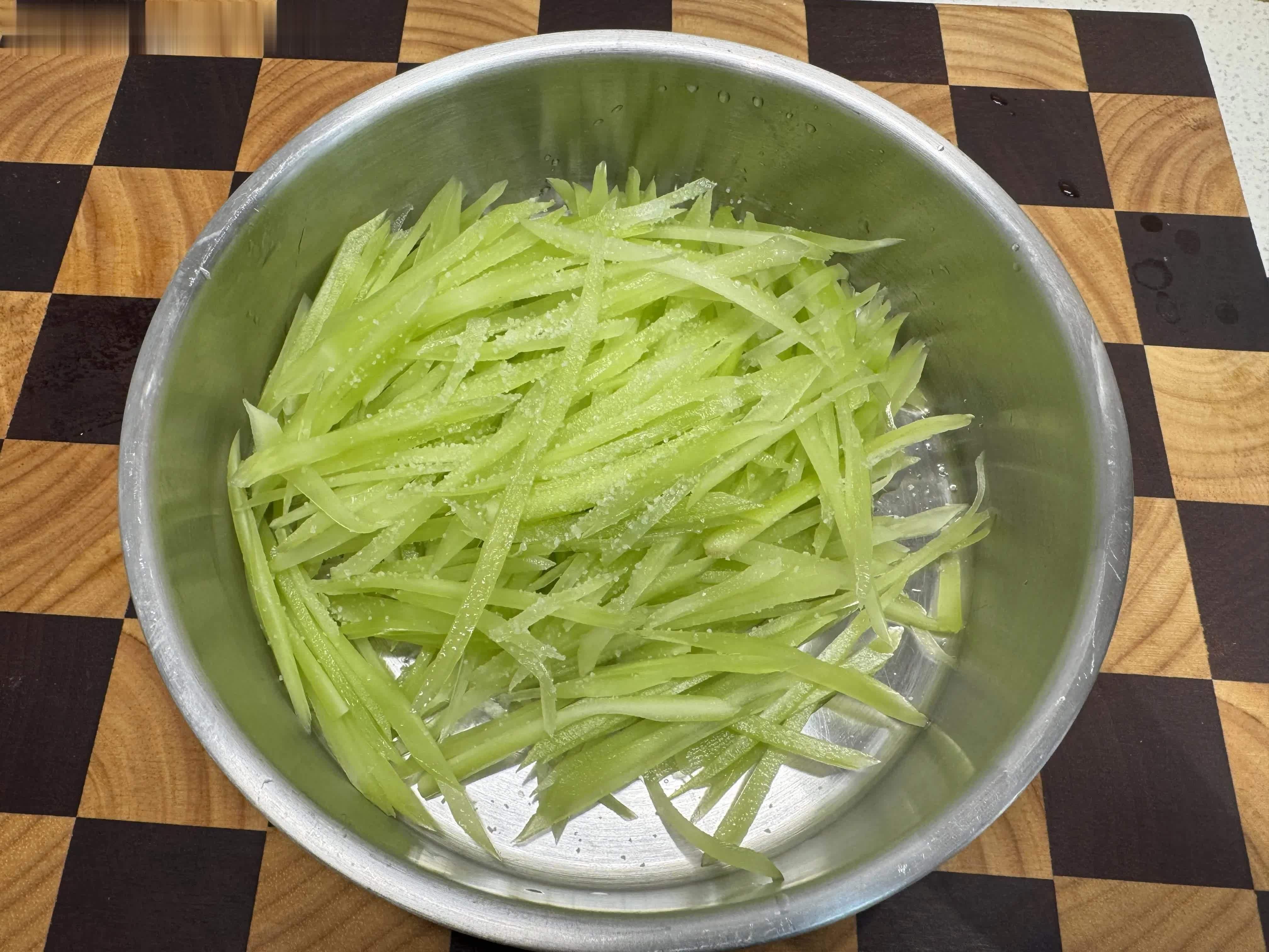 2,往莴笋丝里撒少许盐,盐的用量就是拌莴笋的用量,不需要太多也不需要太少,拌匀把莴笋腌制8分钟,8分钟后会淅出很多水分,把莴笋稍微用手挤压出更多水分,然后倒掉淅出的水分,这样处理后的莴笋口感更脆,质地也会变软一些,方便凉拌。