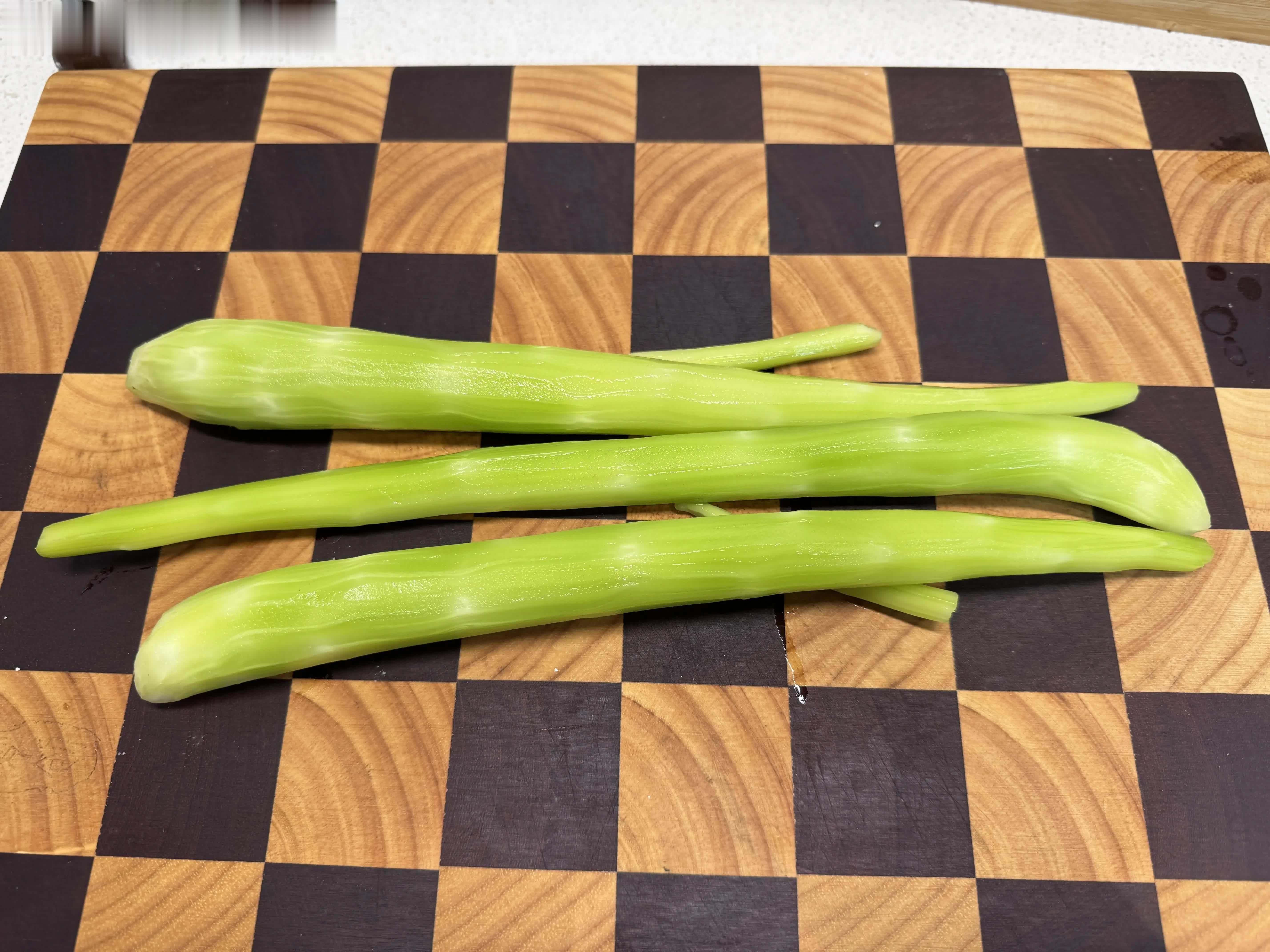 1,春莴笋两根,削去外皮,尽量用刀切成细丝,切出来的丝比擦丝器擦出来的口感更脆。