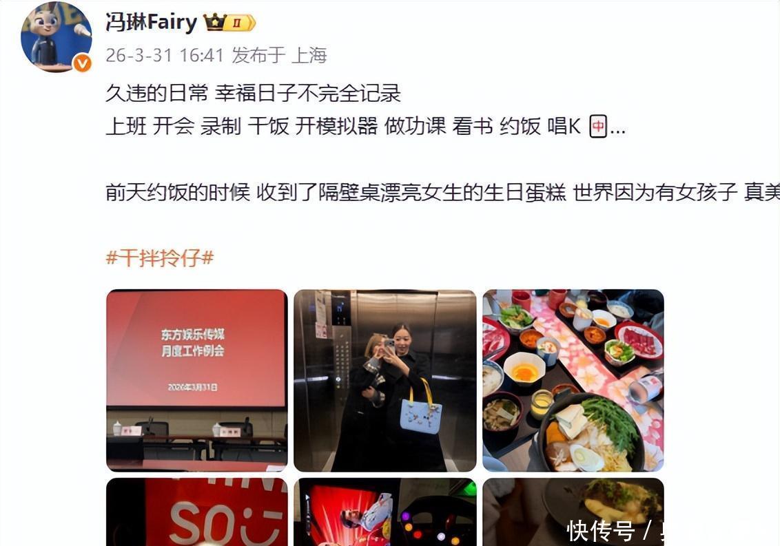 2026年3月31号下午16:41,东方卫视著名电视节目主持人冯琳在其个人社交平台发文称:久违的日常 幸福日子不完全记录上班 开会 录制 干饭 开模拟器 做功课 看书 约饭 唱K …前天约饭的时候 收到了隔壁桌漂亮女生的生日蛋糕 世界因为有女孩子 真美好[期待]#干拌拎仔#
